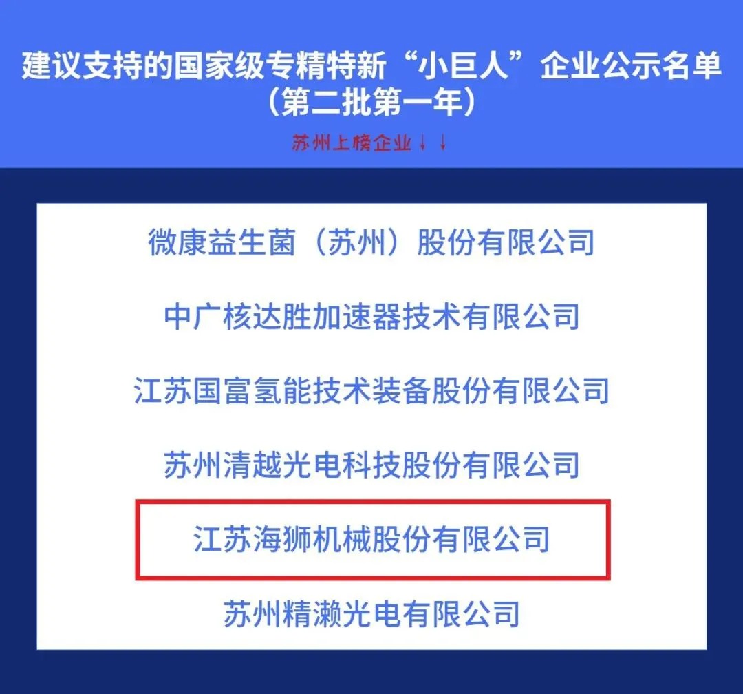 近日,工信部公示了建議支持的第二批第一年國家級專精特新“小巨人”企業(yè)名單中,江蘇海獅機械股份有限公司榜上有名!