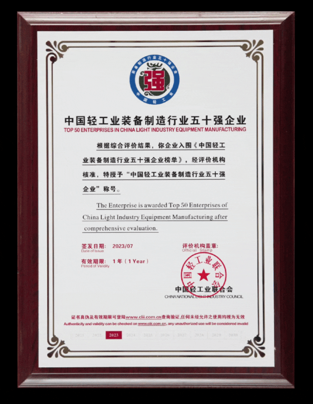 會上,中國輕工業(yè)聯(lián)合會發(fā)布了2022年度輕工裝備五十強企業(yè)評選結(jié)果,江蘇海獅機械名列第15位。