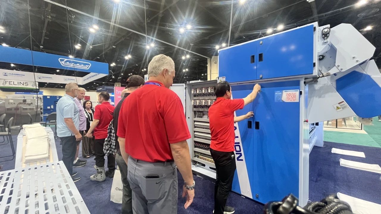 “Titanium”鈦系列洗脫機(jī)與烘干機(jī),聚焦高效洗滌與節(jié)能降耗雙重優(yōu)勢。通過精準(zhǔn)控溫、智能水循環(huán)系統(tǒng)及變頻電機(jī)技術(shù),實(shí)現(xiàn)單位時間內(nèi)更高洗滌量和烘干量的同時,大幅降低水、電、蒸汽消耗,為用戶帶來經(jīng)濟(jì)與環(huán)保兼具的卓越體驗(yàn) 參展人士對這一系列設(shè)備表現(xiàn)出了濃厚興趣,在現(xiàn)場海獅人員的詳細(xì)操作講解下,他們對中國制造的研發(fā)制造實(shí)力有了更深刻的認(rèn)識,紛紛為海獅機(jī)械的創(chuàng)新能力點(diǎn)贊。