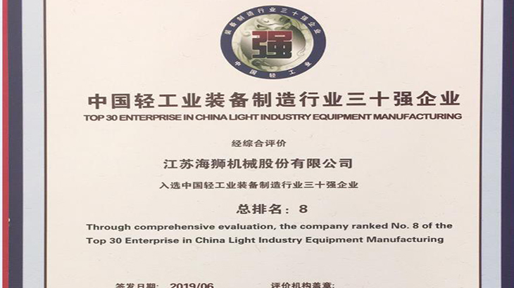 今日江蘇海獅機械股份有限公司榮獲了中國洗滌機械行業(yè)十強首位,中國輕工業(yè)裝備制造行業(yè)三十強企業(yè)第8位,中國輕工業(yè)科技百強企業(yè)第23位為加快建設(shè)強國,推動輕工裝備制造業(yè)做大做強,本著嚴謹、公正、科學(xué)的原則,中國輕工業(yè)聯(lián)合會組織開展了2018年度“中國輕工業(yè)裝備制造行業(yè)三十強企業(yè)”、“中國輕工業(yè)科技百強企業(yè)”評價