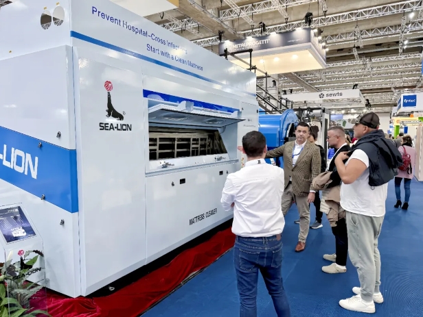 在2024法蘭克福國際紡織品專業(yè)處理展覽會(huì)(Texcare International 2024)的璀璨盛況中,11月6日這一天,德國法蘭克福展覽中心的8號(hào)展廳迎來了全球紡織業(yè)界的矚目焦點(diǎn),為紡織處理行業(yè)繪制了一幅充滿創(chuàng)新與活力的未來圖景。NO.1 現(xiàn)場(chǎng)動(dòng)態(tài)01 海獅現(xiàn)場(chǎng)在這場(chǎng)國際盛會(huì)中,江蘇海獅機(jī)械股份有限公司以其獨(dú)特的展位設(shè)計(jì)成為了展會(huì)